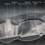 Fiber reinforced polymer (FRP) is the primary material used in this project. FRP is a composite material that consists of laminated fibers and resin polymers. FRP was chosen due to its durability, strength, resistance to corrosion, and light-weight properties. The construction system consists of repetitive vault structures for both the roof and foundation. Based on inputs input from structural engineers. The vault system is used for the foundation to achieve higher strength and material reduction. Each vault is divided into 3 FRP panels for easy manufacturing, transport and assembly. The building structure requires 30 vaults for the roof and 30 for the foundation. The panels can be manufactured at the facility located in Napa and transported to the site via barge. The entire structure is assembled using 180 panels.