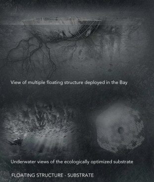 The geometry of FRP substrate on the floating structure is optimized to promote underwater habitats for marine species. Over the time this substrate becomes artificial reef that improves the biodiversity of the surrounding area. The floating structure is designed so that multiple such structures could be constructed and deployed to multiple sites throughout the bay.