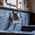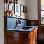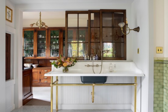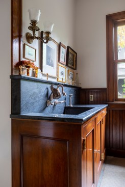 Once a Nob Hill boardinghouse and restaurant, the Colonial Revival–style Portland home has been lovingly restored by its project-loving designer owners. One of the major projects was the kitchen, which had been covered up by cheap cabinets and appliances temporarily mounted to the surface—a product of the 1970s. Beneath the ’70s-era additions was original white, hexagonal floor tiling and green, brick-set, crackle-glazed tiles along the walls.