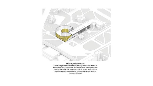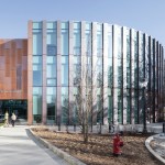 Prominently situated on Haigis Mall near the entrance to the campus, a dramatic triangular glass entrance created by a domino-effect greets students. The building exterior is wrapped in straight, vertical pillars that gradually slope downward, creating a distinct appearance without any curved elements. The Business Innovation Hub directly extends the school’s existing 1964 building from the north and east sides in a wide circular loop, linking back on the upper floors to maintain connectivity. The loop consolidates Isenberg’s faculty and staff under one roof, creating a singular place of arrival and a strong visual identity for the entire Isenberg School of Management.