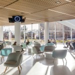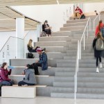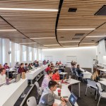 The Business Innovation Hub’s exterior is clad in copper, so long-term exposure to the elements will naturally weather the metal from a dark ochre to an enduring patina. With longevity and sustainability in mind, the building also targets LEED Silver certification. Upon entering, students and faculty arrive at the 5,000SF Learning Commons. Daylight peers between the accordion-like pillars to illuminate the multi-story atrium, where the heart of the business school hums with students learning, networking and dining. The bright and spacious Learning Commons doubles as an event venue for guest speakers, award ceremonies, banquets and career fairs. In any room or hallway, natural light reaches inside from both the campus and the inner courtyard.