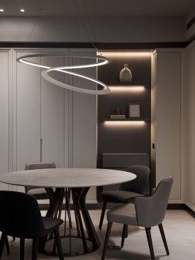 At the center of the home stands the kitchen island. Soft light illuminates the entire space, enlightening each family memberās individual activities, while simultaneously allowing the gaze to flow fluidly onward into the living and dining rooms, drawing the separate areas into a connected whole. When their independent activities draw the family members apart into different areas of the house, they remain connected and indirectly engaged in each othersā lives, creating a harmonious balance.
