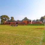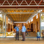 More than half of the building materials were sourced on-site, and over eighty-five percent were sourced regionally (within 100 kilometers). These materials included clay, sand, and stone for foundations and walls, as well as local grasses, woods, and eucalyptus bark for screens, sun shading, and acoustic dampening. We recruited and trained a local workforce, hiring under-employed villagers with no prior construction experience to build using seismically stable techniques like SRCCD’s ModernBrick system, which uses locally sourced raw materials and requires less mortar. For smaller spaces, we used Interlocking Stabilized Soil Blocks (ISSBs), made on-site without petrochemical components. The building also features off-grid technologies, including rainwater catchment and retention systems, landscape formations for seating and rainwater management, biodigester systems for toilets and composting, passive ventilation, natural daylighting for 80% of lighting needs, and solar panels for electrical power.