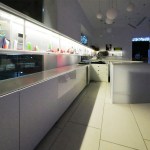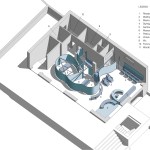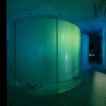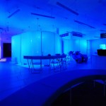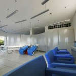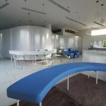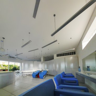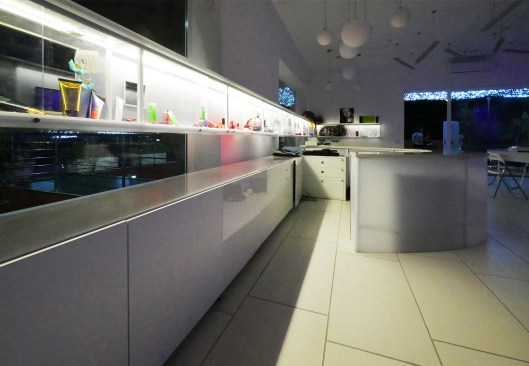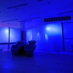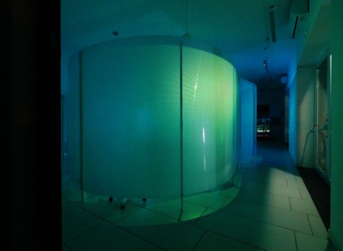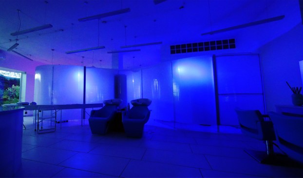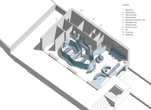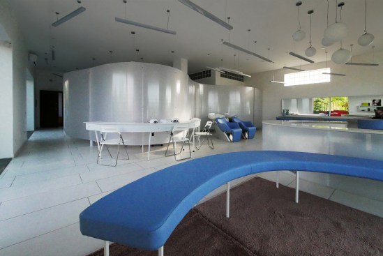 In the project, a curving translucent ribbon occupies the central space. This space can be divided by retractable curtains into four sectors: three cabins for massage and one for pedicures. The polycarbonate makes it impossible to see into the cabins, making them private but allowing the light to pass through. This makes the central body of the space seem like a living organ, particularly in the evening when the iridescent light from the chromotherapy simulates a kind of pulse.