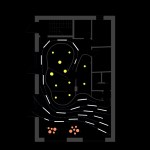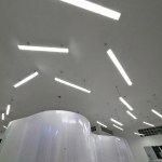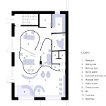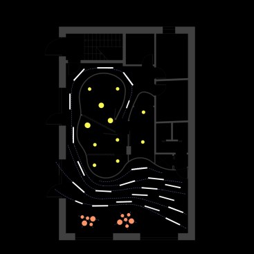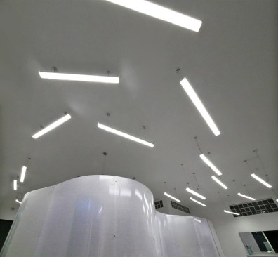 The light fittings have been positioned in accordance with three principles: the rectangular fittings follow the curve of the internal routes, those in the massage area are distributed on a grid, and those in the reception area are composed as groups.