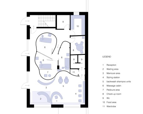 The front part of the wellness centre is a large open space, with a long display case that traverses the whole space. This area contains the reception and a bench in the waiting area, opposite the manicure table. The curved shapes of these elements are set off one against the other. The extreme repetition of curved shapes generate a dynamic space that encourages customers to move and walk around.