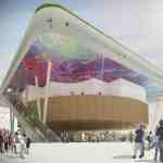 The suspended cylinder of the exhibition space is characterized by the use of the wood finish on the whole facade. It is composed of long vertical panels of Canadian cedar wood that in post-Expo will be used as shutters that open to allow the entry of light through the windows in laboratories distributed around the entire perimeter.