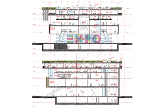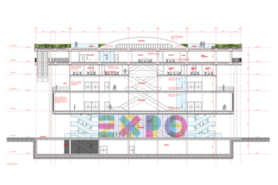 This solution respects the request for an floor to floor height 5.5 m for the exhibition space and allows interior ceiling up to 4.5 m.