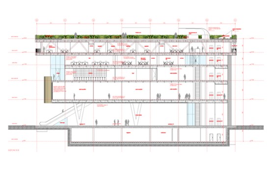 This function is emphasized by a large escalator that allows access to the Roof Square (Piazza Alta) directly from the street of the Cardo.