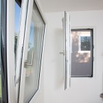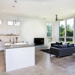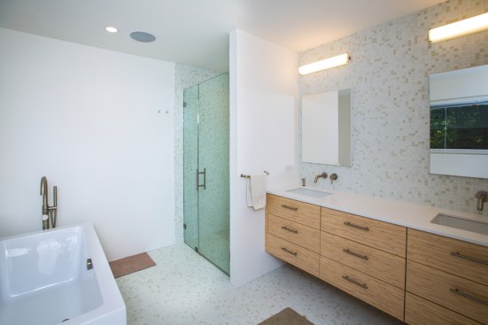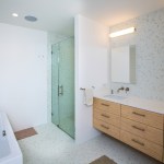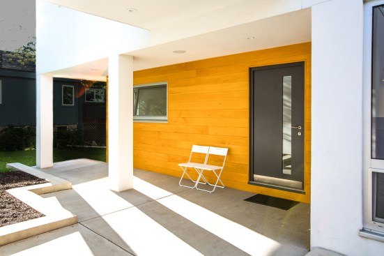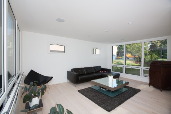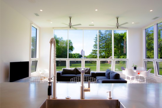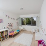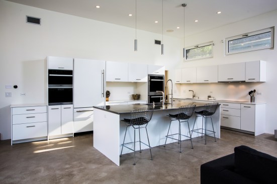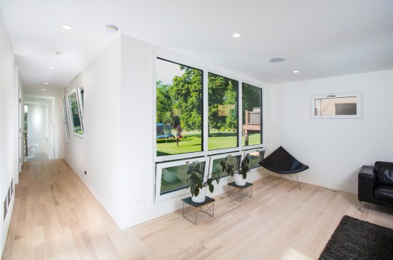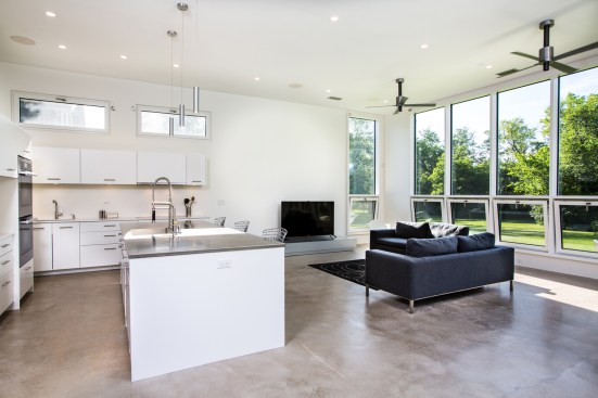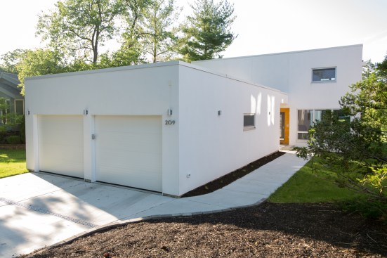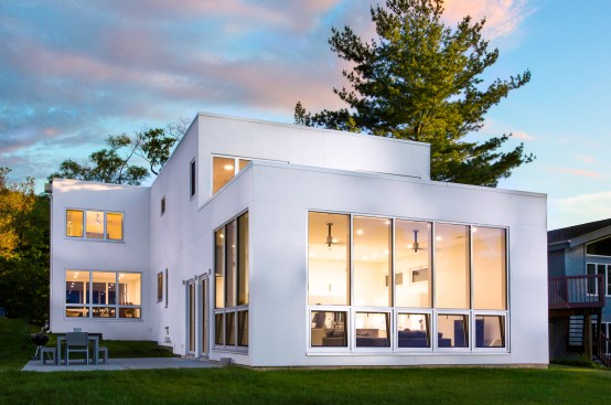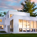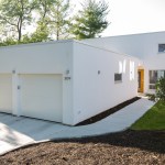 This modern house was designed for a young couple and their collection of modern furniture. Located in Itasca on a long wooded site that backs up to a small lake. The site while long is in close proximity to its neighbors on either side. One of the primary considerations of the design was to address the views towards the lake and create a measure of privacy between the neighbors. Located on the first level are a guest suite and office, and a small formal living area. A small corridor connects to a stairway that descends, following the sloping site, to a large open space that contains the main family room and kitchen. Highlighting the family room is a northern wall of glass 12’ high, looking out to the back meadow and lake. The curtain wall of glass is being developed by Unilux windows from Germany. This curtain wall is triple glazed and has a high insulating quality not yet found with U.S. window companies. The mullions which will hold panes of glass approaching 400 pounds, are a slim 1-1/2” wide, to maximize views. The second floor will contain 4 bedrooms, including a master suite and master bath that has a walk in closet, separate shower, tub and toilet areas. Each bedroom has its own bathroom as well as a walk in closet. Laundry facilities are located on both the first floor mudroom and second floor.