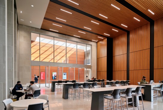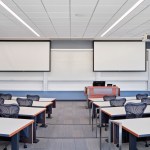 Creative solutions for universal design and access have allowed the design of the expansion to manage grade changes on the site to graciously create access for all. The design team worked to remove any barriers to entry and to establish equal access to classrooms and support areas throughout the expansion. Tiered classrooms can typically create an inherent separation in accessibility for individuals with disabilities with limited entrance access and space functionality for wheelchairs. Previously, the existing facility’s ADA accessible entrance point to the College’s series of tiered classrooms was located down a narrow corridor that was separated from the public circulation pathway. To create an integrated accessibility solution for a barrier free entry into classroom spaces, the team designed a sloping main hallway which creates an open, welcoming, public circulation pathway to provide equal access to classrooms for all students. Bathrooms in the expansion also provide gracious space in design organization no door barriers.