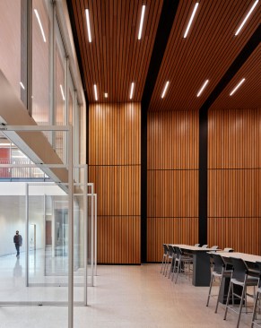 The Gerdin Business Building Expansion at Iowa State University creates a dynamic nexus and intellectual center for the Ivy College of Business. The design expands the College’s ability to foster collaboration and innovation among business scholars through modern teaching methodologies, impactful research, and community engagement. Located within Iowa State’s central campus, the Ivy College of Business had previously started to outgrow its existing space and aimed to create a seamless addition that both respects its original building and allows the College space to grow. The expansion provides multiple settings for student learning including formal, tiered classroom settings; huddle rooms and team rooms for student collaboration; faculty offices; and a suite of behavioral sales labs for the College’s business sales program.