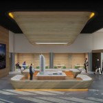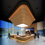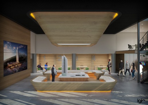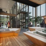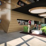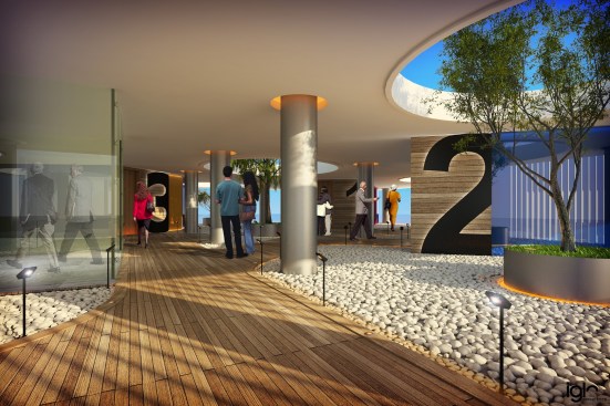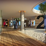 Big digital screen placed just opposite the entrance covering a wall forms a background to the project showcase; a big yatch formed platform emphasizing the marina.