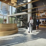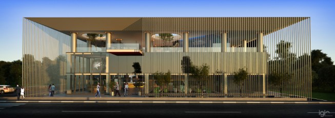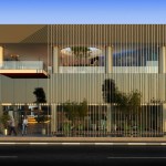 The vertical sun breakers make a visual effect of a waterfall falling from the roof into the water surrounding tha building which lightens the bulk mass of the building.