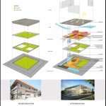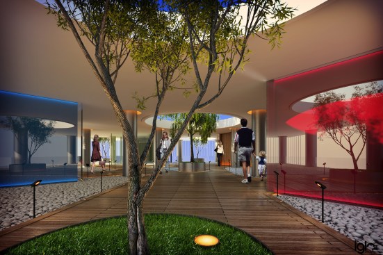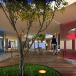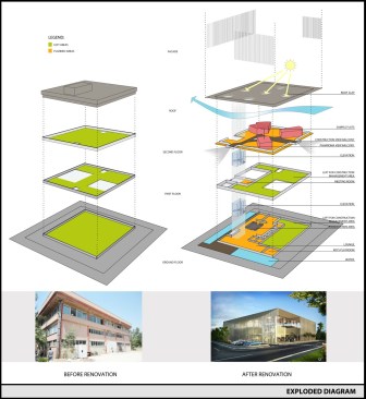Walls on the top storey are demolished and roof slab was partially torn to create a semi open space with a garden effect. Shaded spots and breeze would be perfect for the showcase area of sample flats and hot climate of İzmir .