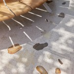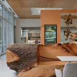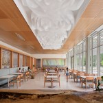 Biophilic design elements are woven throughout the visitor center, including custom terrazzo flooring that reflects the local landscape with inlays of river rock and Missouri woodland-inspired brass accents; ticketing and visitor engagement desk forms influenced by the rounded rocks and pebbles; and pendant lights calling to mind fireflies, stars, and droplets of rain. Walls dividing the dining areas and café include pressed botanical specimens from the Garden’s collection, while the overhead lighting mimics the form of flora in full bloom. Sassafras Restaurant and Café, designed with St. louis-based architectural partners, Tao + Lee, includes a custom bench and community table made from the trunk of a Shumard Oak Tree that was previously part of the Garden’s living collection.