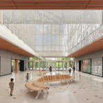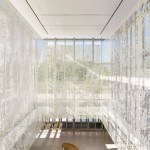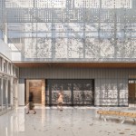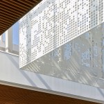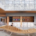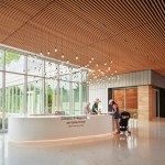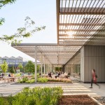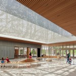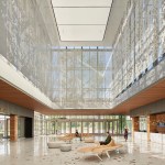The building’s solid north façade and the transparent south façade mimic traditional greenhouse design. Once inside, visitors are immersed in natural light as they take in views through the lobby of the extensive gardens beyond. The lobby axis is centered on garden paths and fountains, providing an immediate sense of place. The visitor center’s main lantern feature is suspended from the ceiling and includes a custom-designed scrim perforated in a pattern inspired by tree canopies. By filtering dappled light into the lobby, the lantern evokes the feeling of entering a clearing in the woods. At night, the glow of the lantern welcomes visitors and the community.