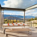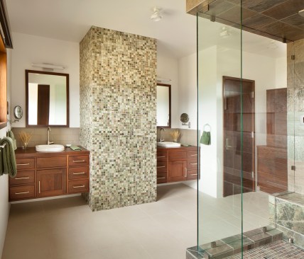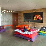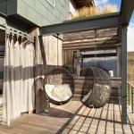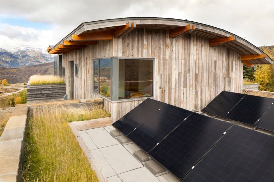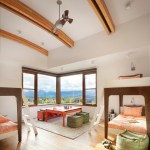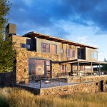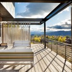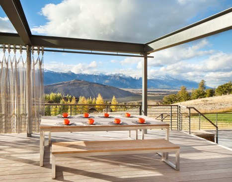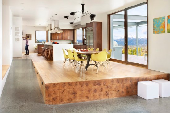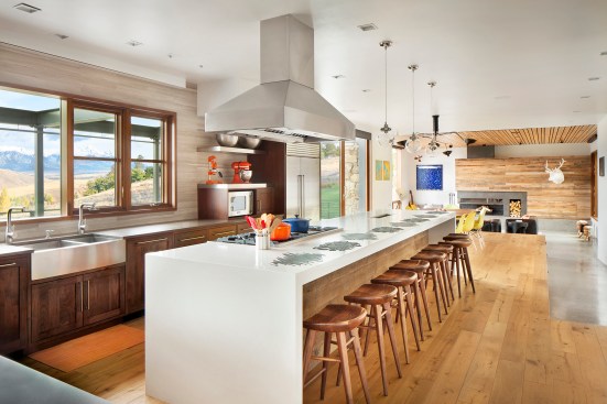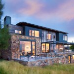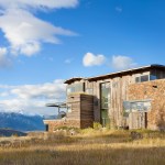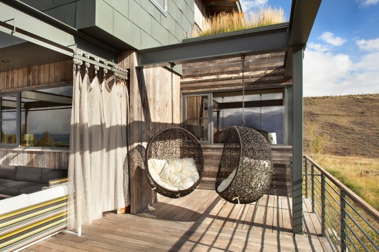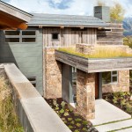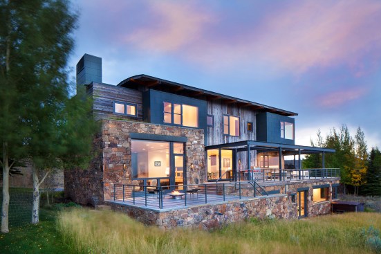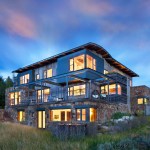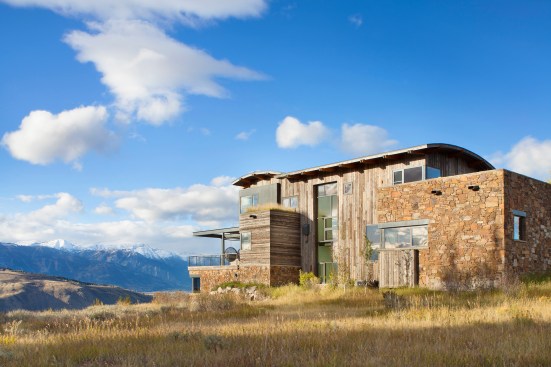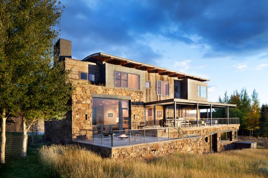 Perched high on a double sloping site in Jackson Hole, Wyoming, this residence affords spectacular views of the Teton Range and incorporates many unique and whimsical features in a warm yet contemporary package. Heated concrete ramps connect multiple layers hugging the terrain. An indoor slide complete with infinite hue changing LED’s connects the main level with the recreation room. Solar panels, green roofs, flat screen panels inlaid into the entry floor, triple stacked bunk beds, mechanized fireplace doors that slide up out of site, a Pickard steam injection pizza oven, and adjustable chain mail shade curtains on a trolley system are a few of the custom features wrapped in an exterior of zinc panels, corral board, steel and moss rock.