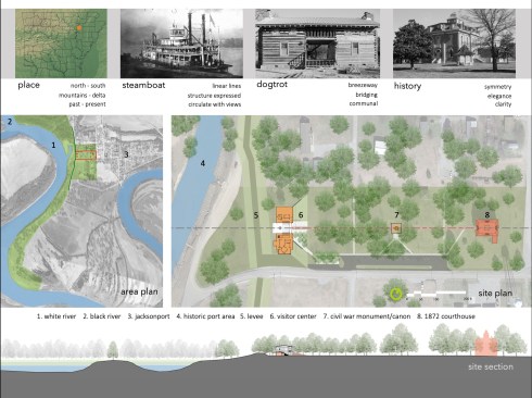 Situated at the confluence of Arkansas’ White and Black Rivers, Jacksonport was a thriving 1800’s port town serving steamboats that held up to 200 passengers. It’s a place of contradiction geographically and historically, where the Mississippi Delta meets the mountains. Because of its accessibility to the Arkansas and Mississippi Rivers, Jacksonport was a Civil War strategic stronghold, being held five different times by Union and Confederate forces and serving as each general’s headquarters. Most importantly, Jacksonport was the location of the Confederacy’s surrender of Arkansas. In 1872 a beautiful Courthouse became the town’s centerpiece and county seat. When the railroad bypassed Jacksonport and river commerce waned, the town suffered. Devastating floods led to levee construction that forever separated town from river. In the 1960’s, to save from demolition the only historically significant structure left, the courthouse, a new State Park was established. Visitors, however, were still separated visually from the river. While our task was to design a functional Visitor Center, our challenge was to create a stage to experience and engage both river and town, past and present.
