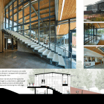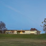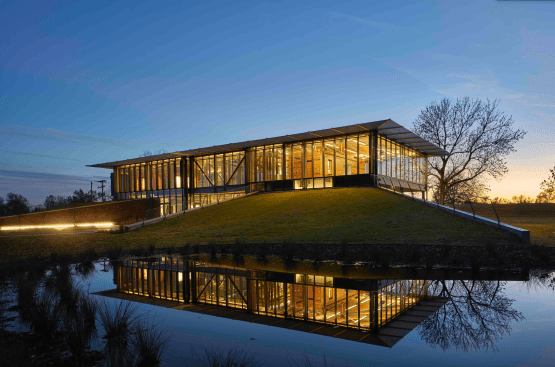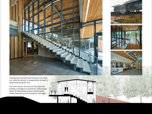 The center creates three distinct second level exhibit experiences: The river gallery overlooking the port, the town gallery overlooking the park/courthouse, and the exhibit gallery sheltering light-sensitive displays. Three free standing metal and wood clad volumes (gallery, elevator, and service) are inserted like cargo on a ship, allowing perimeter circulation with views along the glass exterior. The roof’s expressed tension rod structure free spans the building, a homage to a steamship’s cable-stayed details. An 8’ deep aluminum shade protects exhibits, maximizing views, extending the roof and minimizing its edge. The visually simple but rigorously detailed glass enclosure creates an elegant platform that recedes into the levee visually from the park’s historic structures. A berm acts as lawn theater for reenactments, while the entrance plaza’s grove of six trees represents almost 6000 Arkansans whose war ended in this place.