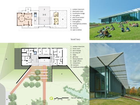 Lifting the park up physically and visually (even with Corps of Engineers restriction of not building within 15’ of the levee) to see both river and park simultaneously became paramount. The War’s history, two entities becoming one, generated a diagram drawn from another historic Arkansas structure, the “dog-trot”. Conceived as a modern dog-trot, the new Visitors Center juxtaposes two glass cubes imbedded in the earth representing the divided North and South under one roof connected by a bridge…a symbol of reunification. An outdoor classroom that the roof bridges allows visitors to climb above levee height to view the river for the first time since levee construction, extending the park experience visually to the water.