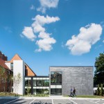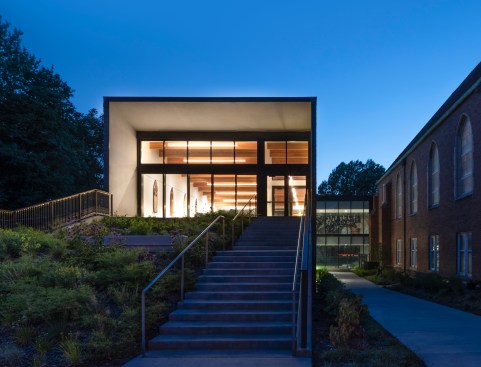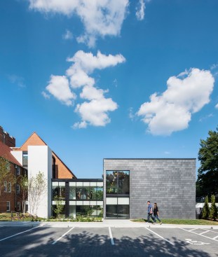 In collaboration with church leadership, the design team has worked to provide more gathering space for the community while upgrading accessibility deficiencies at the existing building. The addition includes a fellowship hall, where the congregation can meet before and after Sunday gatherings, provide educational space for various programs, and host special functions such as rehearsal dinners. It also provides flexible working and meeting space, and a space dedicated to youth education. The addition is connected to the existing building by a glass-enclosed link that allows for visual connection between two courtyard landscapes: an informal playground and a more formal contemplative space. Direct access to the link also provides at-grade wheelchair accessibility direct to an elevator that provides new access to all three levels of the existing building and addition.