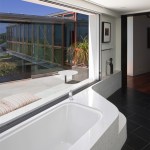 A new mosaic marble soaking tub extends the length of the telescoping door, which is set at tub height to seamlessly connect to the existing exterior courtyard. During social gatherings on warm nights, the tub can double as a small pool. The mirrored interior wall reflects the scenery, further joining the two spaces. Whether standing in the glass-enclosed shower, soaking in the tub, or seated on the adjacent bench that spans the opening, the amenities offer instant access to the home’s breathtaking ocean view while also allowing natural daylight to the interior.