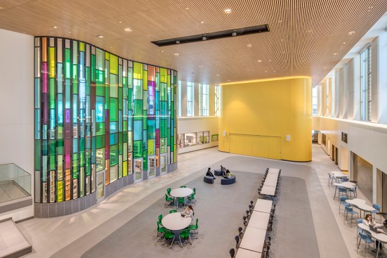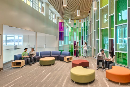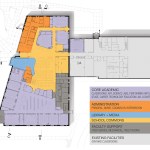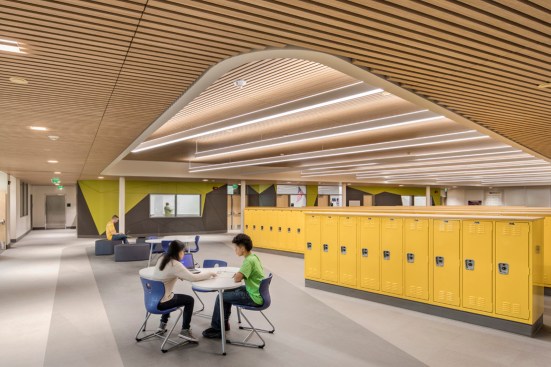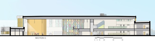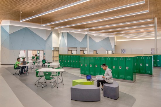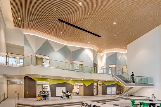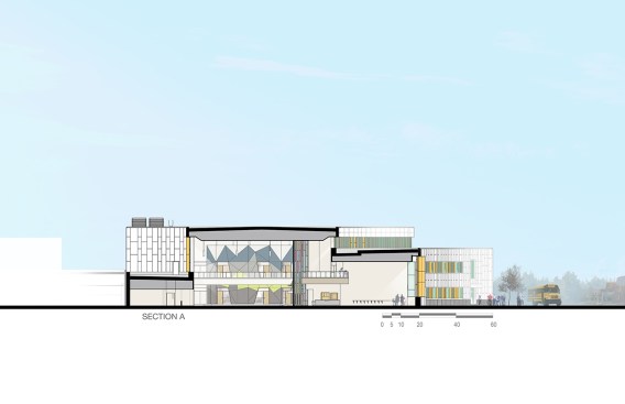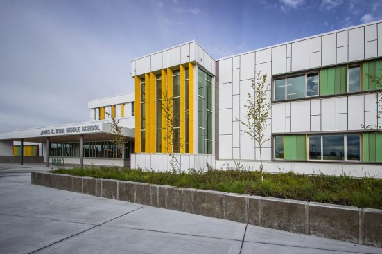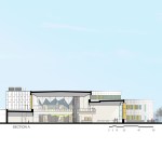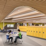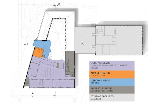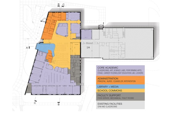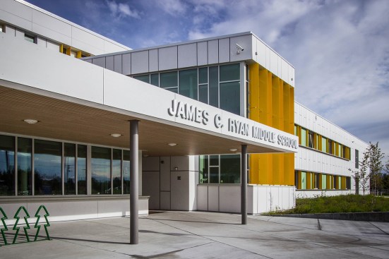 Key components of the design of the Ryan Middle School replacement were formulated during the educational specification Planning Labs with borough and school district personnel, students, school administrators, and teachers. Bettisworth North worked closely with Perkins + Will designers to create a flexible and inspiring solution. The heart of the school is the common area, surrounded by the media center, performing arts space, kitchen, and stage. Classrooms and teaching areas, along with lockers and project based learning spaces, are arranged around the common area. Classrooms have operable partitions between them to allow rooms to expand and a high level of transparency to the project resource area, allowing passive security to this space and the resource rooms beyond. The school media center opens to the commons area, expanding opportunities for larger groups to experience media resources and promote a more active academic environment. Energy efficiency measures include the use of high efficiency windows, well insulated walls and roof, displacement ventilation, LED lights, occupancy and daylight sensors, which automatically dim or shut off lighting when not needed, and efficient building systems such as Displacement ventilation, and natural gas boilers with district heat back-up, and diesel back-up power generator.