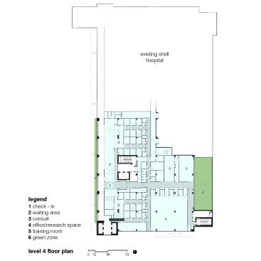 archimania led visioning workshops to better understand the Institute’s diverse needs of the patient, caregiver, healthcare provider, and support personnel. The design intends to enhance the delivery of care before, during, and after a transplant. The team worked to create a more humanized and progressive patient care experience that maximizes the use of actual and perceived natural daylight to expedite healing while decreasing perceived wait times. Through the placement of glass layering, nearly 100% of the occupiable space has views to the outside or to daylight, which is unusual in a healthcare environment.