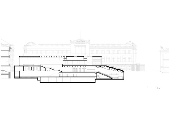 Three flights of wide steps, set between the elongated plinth and the lower colonnade, invite visitors into the building. Arriving at the upper level, visitors enter a generous foyer, with direct level access to the main exhibition floor of the Pergamon Museum. The foyer also encloses the cafeteria and opens out onto a grand terrace that runs the full length of the building. A mezzanine floor beneath the main entrance foyer accommodates the museum shop, a large cloakroom, toilet facilities and lockers, while the temporary exhibition spaces and an auditorium are situated in the basement level.