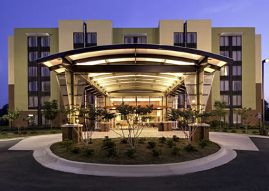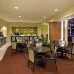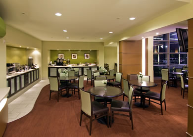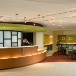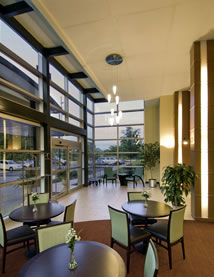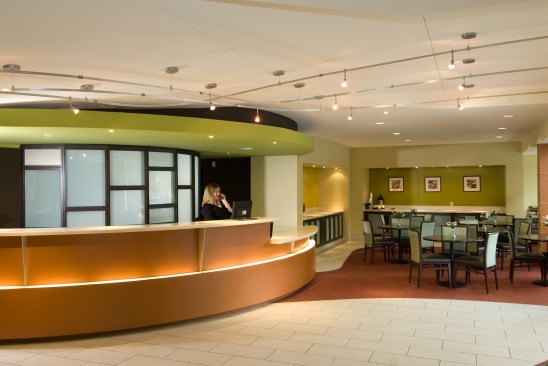 The addition of a two-story component with storefront glass at the entrance allows a grand feel to the reception spaces. Rich fall colors and a contemporary energy greet the guests. The flow is continued with staggered ceramic tile and a linear patterned carpet in a comfortable curve that lends movement throughout the lobby.