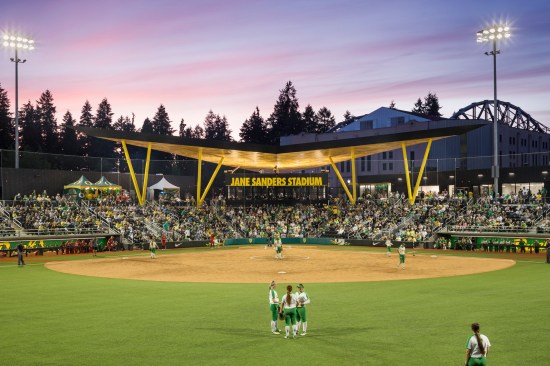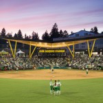 The Stadium was designed to achieve LEED Gold certification, a unique accomplishment in the world of sports facilities. The building also meets UO’s aggressive Oregon Model for Sustainable Development, with an energy reduction of 35% over Oregon Energy Code. The building also reduces water usage by 37% with low-flow fixtures and irrigation savings measures. Turf was chosen for the outfield for its low irrigation and maintenance requirements. The stadium bowl is built from a prefab system. The components have a high recycled content, are easily maintained, and at the end of their useful life, can be deconstructed and recycled again.