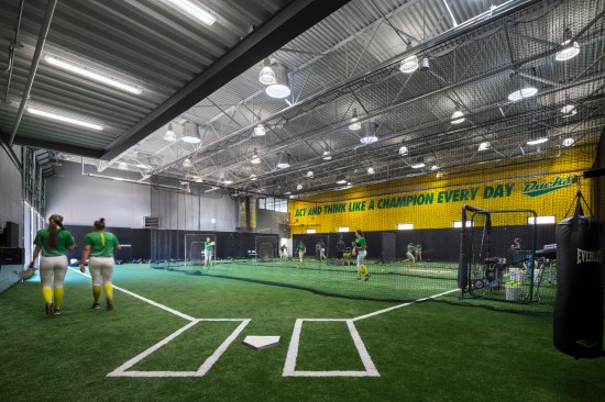 Jane Sanders Stadium consolidates three integral facilities — stadium, team building, player development building — in one location. Before, these facilities were scattered across campus. The team practiced in a shared facility, received medical support in another location, and played games at a third location. Athlete growth is supported on every level in the new integrated facility. Now athletes can work out throughout the day in a state-of-the-art training facility, complete with computer-aided batting technique analysis and a room for watching game films.