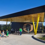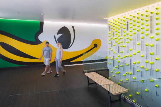 SRG worked with UO Athletics to fully integrate the Duck brand into the stadium. Bold yellows pop out from the stealthy, black façade of the box office and team building. The iconic wing-shaped structure soars high above the concourse and seating bowl and has become synonymous with Oregon softball’s innovative brand. Key themes—stealth, feathers, the Sanders Family donor story and tie to the local wood industry—influenced the design process and appear in the forms and materials. The outcome is a unique and identifiable visual articulation of the UO softball story—combining innovation, ducks in flight, the Sanders Family, and sport.