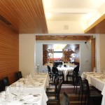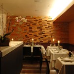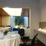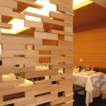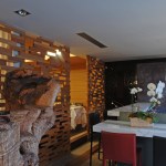 Being a former house from the late 40s, the project had to be adapted to fit this two level construction. In the ground floor there is a lounge and bar area used both for reception and for the clients that only stop for drinks. After, a big double height salon is founded and ends in a fantastic interior garden. This ample dinning room has a very warm atmosphere created by the combination of zebra wood covering walls and mahogany wood on the ceiling. For the floors a very interesting combination of stone and wood was achieved.
