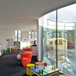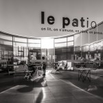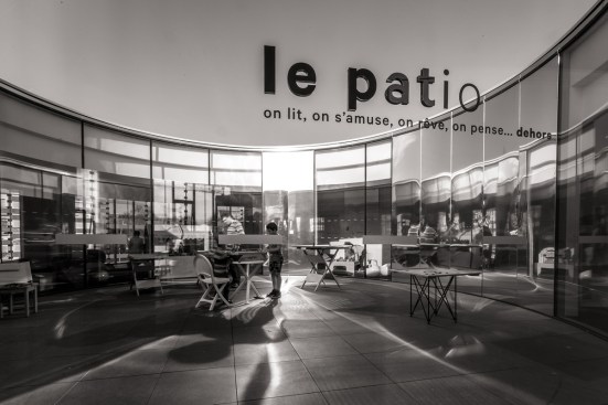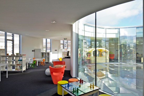opening toward the game library and the Médiathèque, and protects the inside
