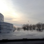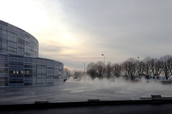 within a subtle mist coming from the ground and transforming the forecourt into