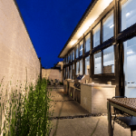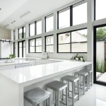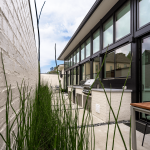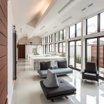 An exterior courtyard parallels and mirrors this large interior space with a central outdoor kitchen. The boundary between these two zones is blurred by a 12′-tall glass wall, creating a heightened sense of spaciousness and connection with the outdoors. The 8′ brick wall encloses the interior/exterior space at the street and provides privacy in the dense community.