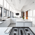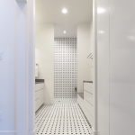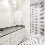 Within the large, open interior space, living, cooking, and dining areas are arranged shot-gun style. This public realm is highlighted by a shifting ceiling plane that creates subtle spatial boundaries, diffuses and directs the natural light, and provides alcoves with dimmable lighting that can be adjusted to suit any occasion. The centrally located kitchen offers bar seating at both ends to create ample seating for large gatherings. Appliances and cooking supplies are tucked away in generous cabinetry to create a minimal aesthetic.