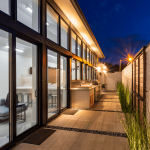 The private zone contains three bedrooms, an office, and two and a half baths and is separated from the public zone by alcoves and sliding ipe doors at each guest room entrance.