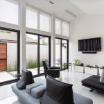The building orientation takes full advantage of natural light, an uses the courtyard wall and soffit to reduce thermal gain. The high gloss floor and shifting ceiling brings diffuse light to the entire living-kitchen-dining reducing the need for electrical lighting in daytime hours. All appliances are energy star rated and foam insulation with 2X6 exterior walls create a tight, high performance enclosure. All electrical lighting is dimmable LED Energy Star Lighting, and remote-controlled solar shades allow owners to control the degree of sunlight coming through the window wall.