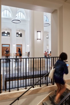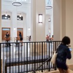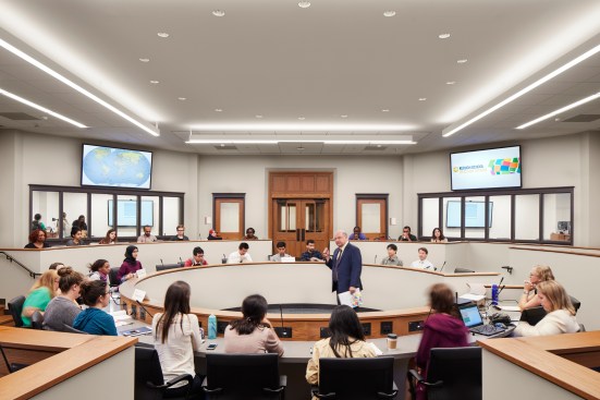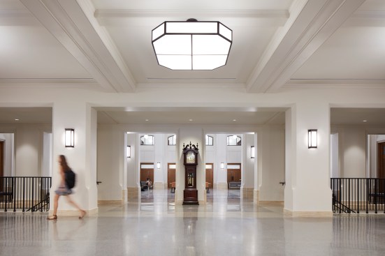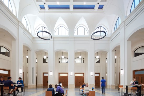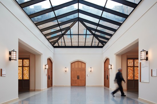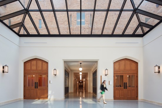 A pair of new conjoined buildings that together comprise an integrated ensemble for the Social Sciences and the University’s community of International Institutes, Jenkins Hall houses the newly established Keough School of Global Affairs and eight of its associated semi-autonomous international institutes. Nanovic Hall is home for the academic departments for Sociology, Economics and Political Science. Located on a key gateway site at the entrance to the University, these buildings establish an anchor to its ceremonial main thoroughfare, and completes one side of one of Notre Dame’s newer quadrangles. Major instructional spaces are located on the first floor and lower level to accommodate ease of movement for students and faculty. The first floor provides an array of instructional spaces as well as various collaborative learning environments. The Forum is the building’s major gathering space, functioning in a multitude of ways, configured to accommodate individual and group study, and easily filling the role of lecture hall and events space. Below, on the lower level, connected physically and visually to the main floor by a pair of open staircases, are all of the typical classrooms and instructional spaces including the Mediation Room and the Integration Lab (I-Lab). The Mediation Room allows both students and faculty the ability to observe diplomacy in action, while the I-Lab accommodates a distinctive series of interdisciplinary pursuits designed to prepare the student for the global employment landscape within an informal, flexible and reconfigurable suite.