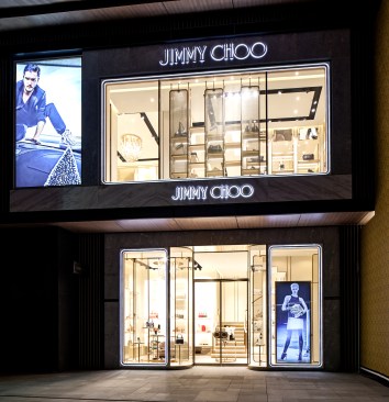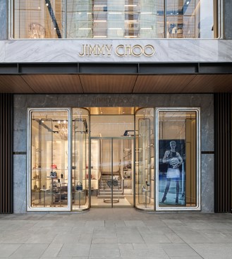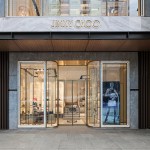 Jimmy Choo’s 140-square-meter flagship in Chengdu, China is a two-level, dual gender store that introduces itself with an “open” façade, the upper part of which reveals the activity in the store. The lower section of the façade is more complex, with rounded edge cartouche framings that marry retro and modern design through lighting installed within the frames. Marble and metal layering is deconstructed to give way to the light from inside the store.