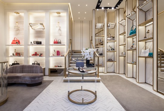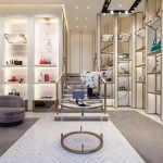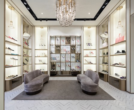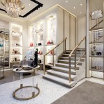 Draped in white Carrera marble, the welcoming feature stairway continues the theme of transparency as it wraps around the showcased product. The decor is lux but warm, featuring gold mesh panels on walls, a chandelier at the entrance with burnished gold hoops and raw crystals, marble floors, rich grey carpeting, and grey-pink walls. Delicate glass globes are suspended over shelves and mirrors that tilt are positioned above shoe displays.