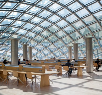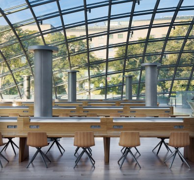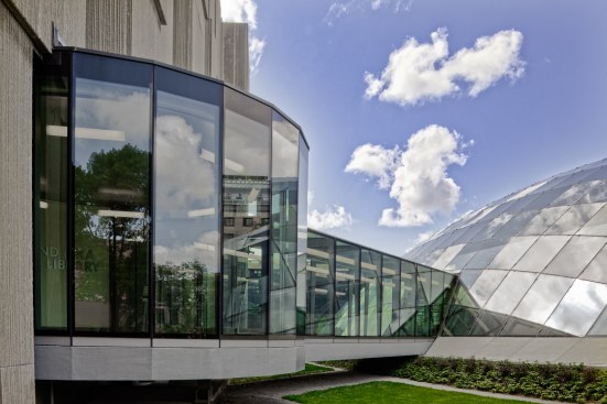 At the interior there is a seamless integration between lighting, air supply and furnishings, which were fabricated in solid European White Oak. More than anybody the users will benefit from an environment that is pleasant and conductive to study and research. This is not your classical Library, but points to the library of the future.