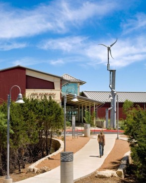 “I wanted to provide a ‘library in the park’ that preserves the land and its history,” commented Heath Wenrich of RVK Architects in San Antonio. “We re-planted wildflowers in the planting areas and among the grasses. The wildflowers had covered the site the summer before construction began. The building is a modern-day version of the typical red barn, complete with a windmill and watering hole.”