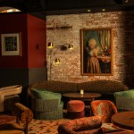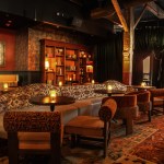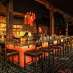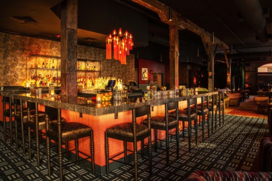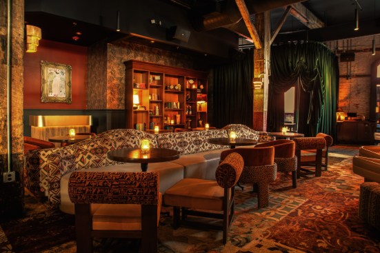 Upon entering the lounge, guests are greeted by an ensemble of furnishings meticulously curated to blur the lines between traditional restaurant seating and residential lounges from small tables and cushioned dining chairs boasting bold prints to textured couches and eye-capturing, velvet booths. Moving further into the open-concept lounge, patrons are drawn to a prominent bar, distinguished by its vibrant coral hue and stone top. In addition to the exposed columns dispersed throughout the space, a red fringe chandelier hangs above the bar, adding an eclectic twist. In the far corner of the room, a private dining area is sectioned off with theatrically draped curtains, exuding a sense of drama while effortlessly transforming the space to accommodate multiple functions without compromising on its overall allure. Every detail, from the plush seating arrangements to the carefully selected dining and tea-height tables, portrays a residential aesthetic that ensures utmost comfort and smooth functionality.