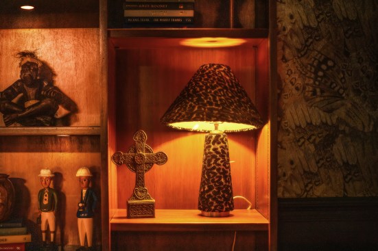 Drawn in by the warm color palette, patrons are welcomed to relax and socialize through the intimate ambiance. The exposed brick and steel structure of the former warehouse lends itself to an inherent quirkiness of the structural foundation. To balance the industrial feel, a custom Axminster carpet imbues residential familiarity throughout the dining area. A patchwork of vibrant geometric patterns, interspersed with motifs ranging from tigers to Victorian women, evokes a sense of whimsical nostalgia while maintaining a cohesive design aesthetic. The New Orleans-inspired concept is echoed throughout the blend of accessories, with most décor sourced from local antique stores and resale shops. Each piece adds layers to the design narrative, including a carousel horse repurposed into a striking lamp, contributing to the myriad of treasures adorning the space.