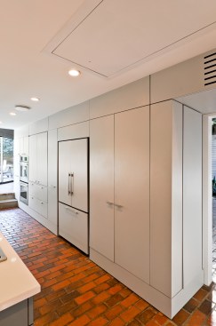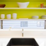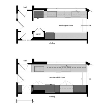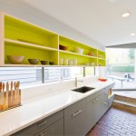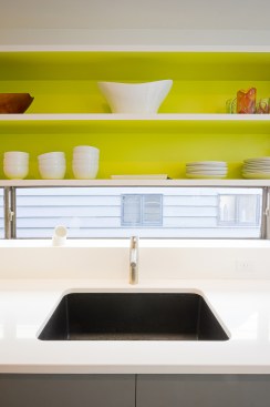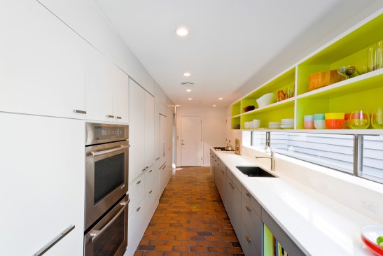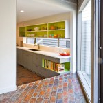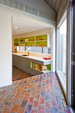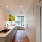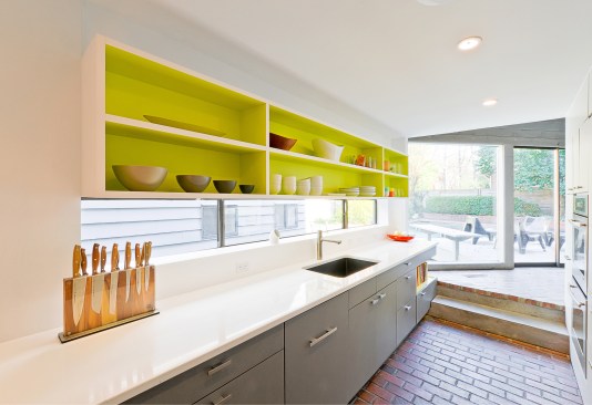 A young couple wanted to renovate a kitchen in their newly purchased 1974 home to inspire new life for future renovations. At the first meeting, the client said, “The kitchen is dated and not very open.” The objective was to provide a new kitchen that would provide more natural light, be more artistic and more functional, retain the existing brick floors, and inspire future renovations. The home had only one owner until the young couple purchased it. The new design should be respectful to the existing house while breathing new life into a home that basically still exists as it was when it was first built. A wall was opened to the northeast that allowed more light and more visual connection the exterior, while the wall cabinets stopped short of the ceiling on one side to allow more openness throughout. Color was used to exaggerate the idea of natural light. On the other side, cabinets were enclosed to conceal clutter and provide contrast to the expansive open countertop. Alignments were made to frame views and add more connectivity to the rest of the home. The architect chose to do design/build in an attempt to keep quality control high and within the Owner’s budget.