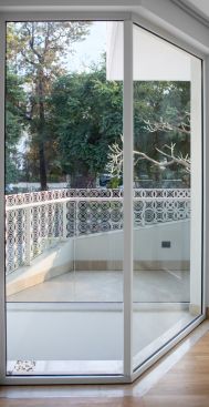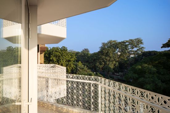 The intricate details of the building take inspiration from the surrounding historical context and the application of local building crafts. The balcony form and the elaborate railing design takes inspiration from the railings of old houses in Lutyens Delhi and stone carvings of the neighbouring homes and cleave in to give way for the patterned MS railing. The pattern of the railing transforms from opaque to more open, in order to deliver a view of the surrounding vegetation. Even though the square footage that could be given to the helper’s quarter is of bare minimum standards, by providing adequate natural light, ventilation and views to the park, the small space has been made habitable. The residence plays an epitome of a perfect blend of contemporary with traditional craft derived from a heliotropic context.